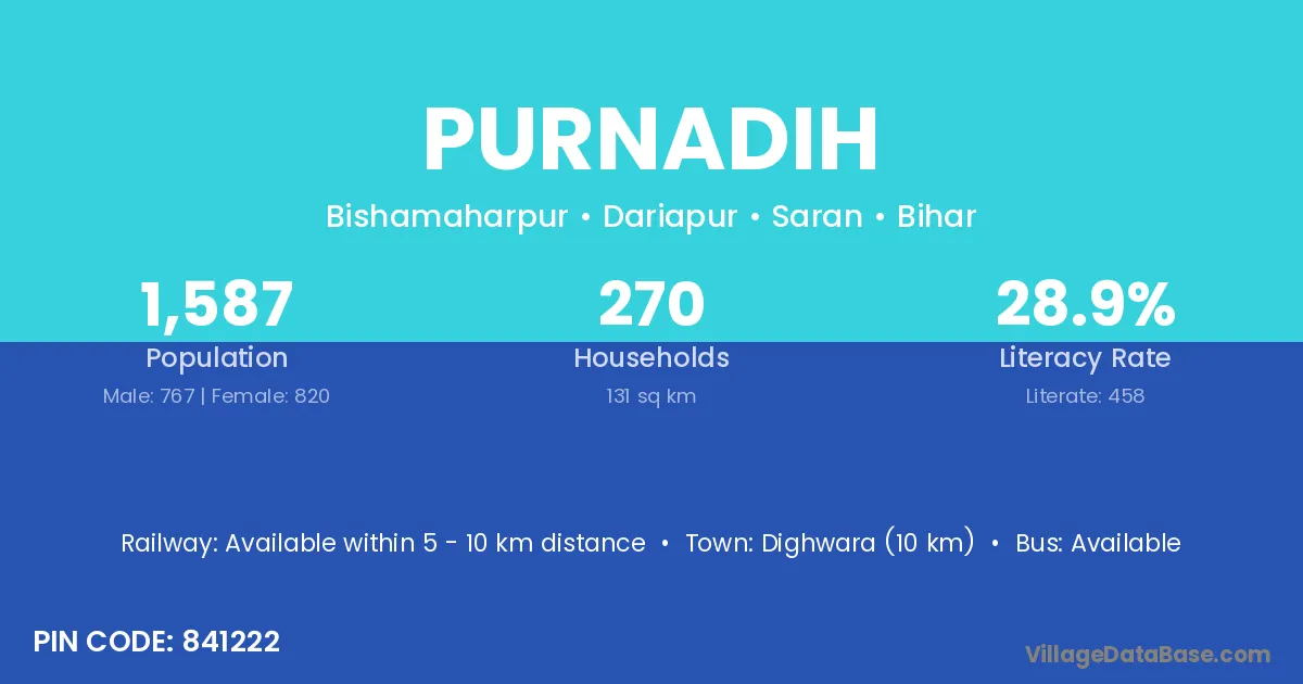 Dighwara (10 km) is the nearest town to Purnadih village for major economic activities and is located approximately 10 km away.