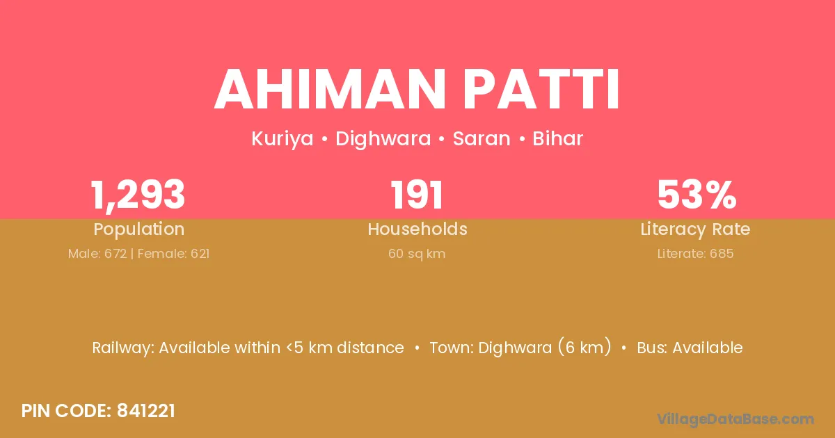 Ahiman Patti village has a total population of 1,293 people, of which 672 are males and 621 are females.