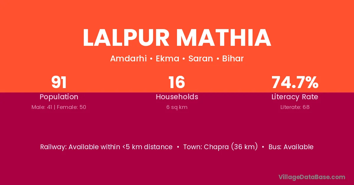 Chapra (36 km) is the nearest town to Lalpur Mathia village for major economic activities and is located approximately 36 km away.