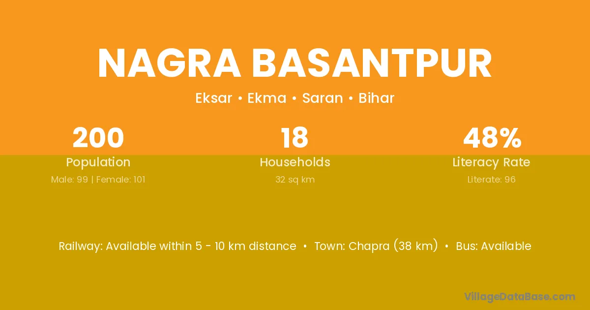 Chapra (38 km) is the nearest town to Nagra Basantpur village for major economic activities and is located approximately 38 km away.