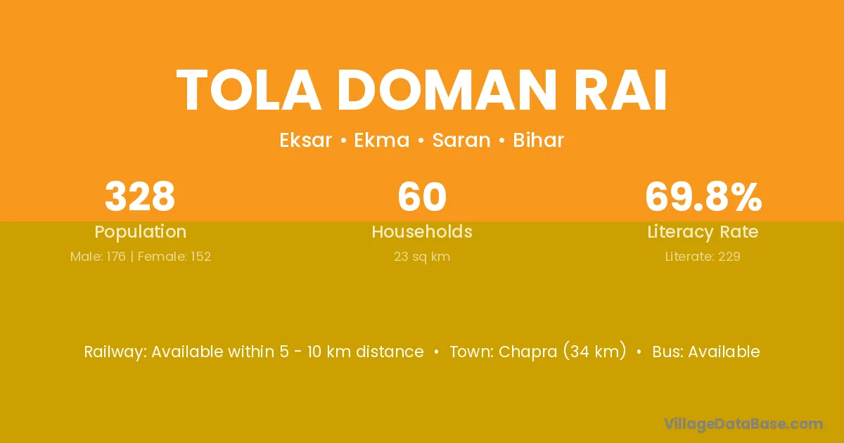 Chapra (34 km) is the nearest town to Tola Doman Rai village for major economic activities and is located approximately 34 km away.