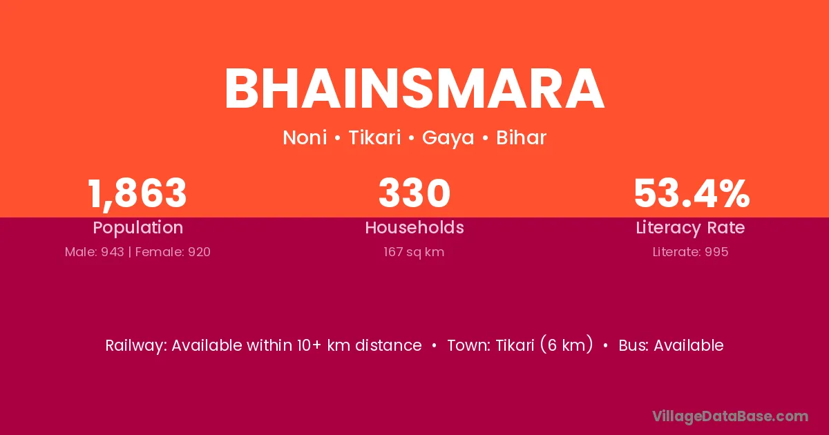 Bhainsmara village has a total population of 2,638 people, of which 1,334 are males and 1,304 are females.