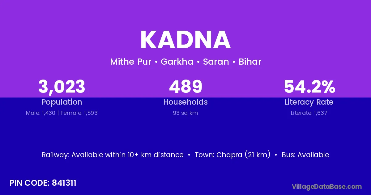 Chapra (21 km) is the nearest town to Kadna village for major economic activities and is located approximately 21 km away.