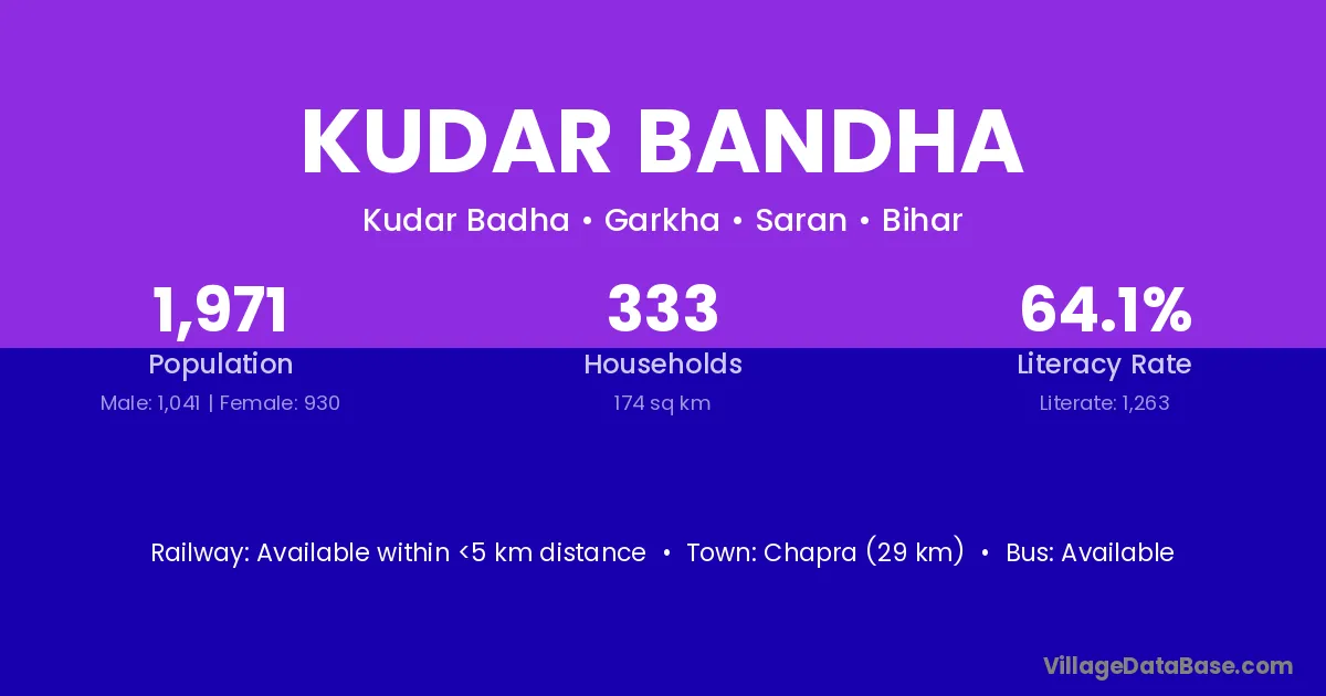 Chapra (29 km) is the nearest town to Kudar Bandha village for major economic activities and is located approximately 29 km away.