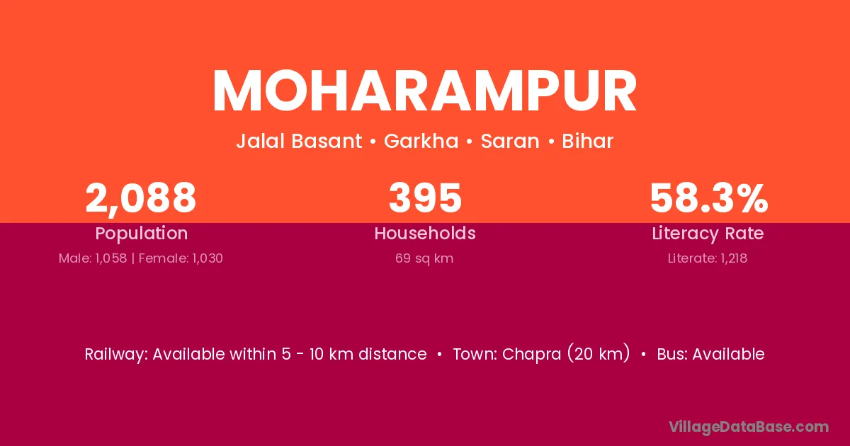 Chapra (20 km) is the nearest town to Moharampur village for major economic activities and is located approximately 20 km away.