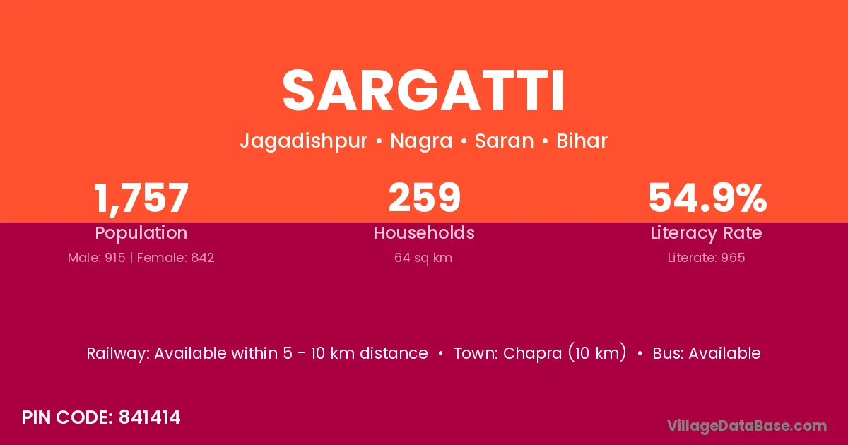 Chapra (14 km) is the nearest town to Sargatti village for major economic activities and is located approximately 14 km away.