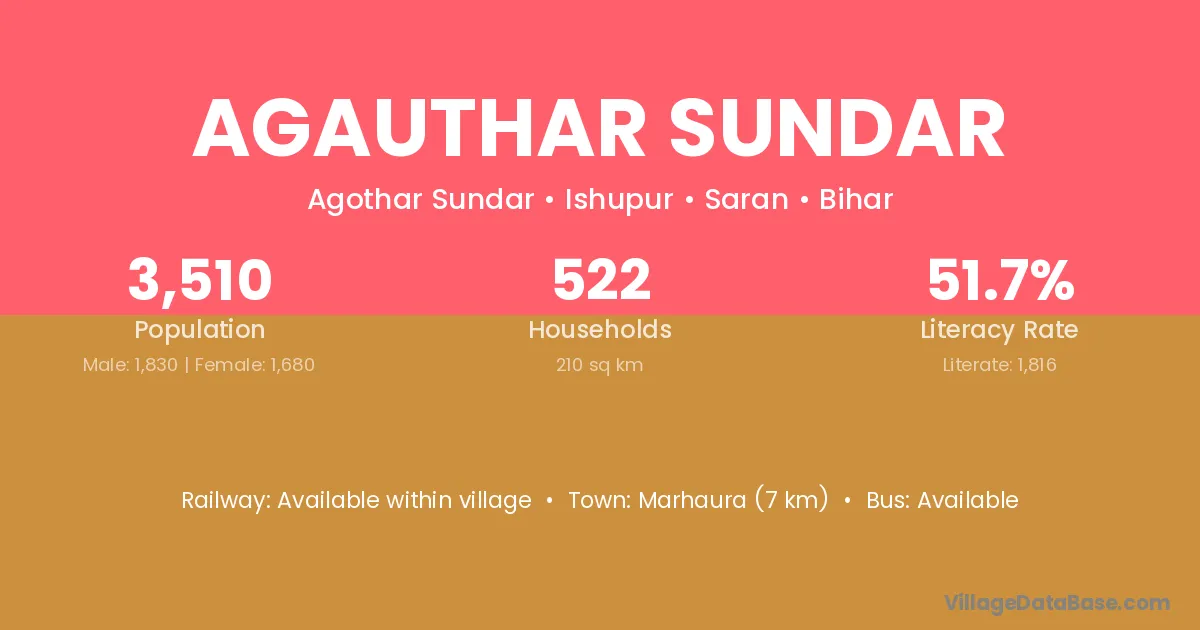 Agauthar Sundar village has a total population of 3,510 people, of which 1,830 are males and 1,680 are females.