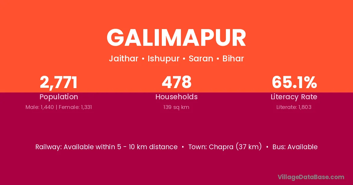 Chapra (37 km) is the nearest town to Galimapur village for major economic activities and is located approximately 37 km away.