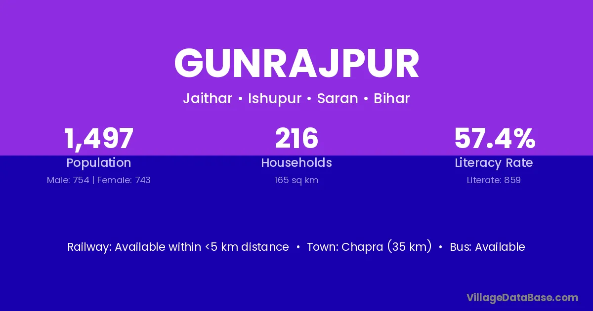 Chapra (35 km) is the nearest town to Gunrajpur village for major economic activities and is located approximately 35 km away.