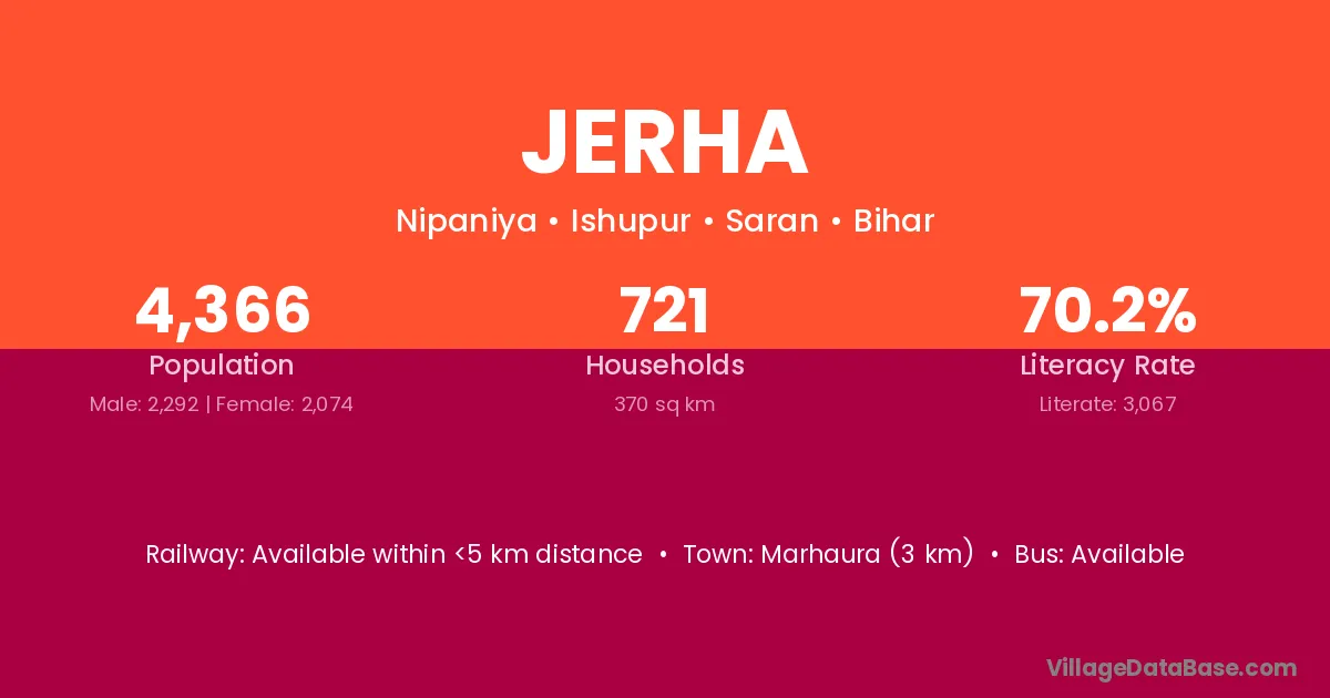 Marhaura (3 km) is the nearest town to Jerha village for major economic activities and is located approximately 3 km away.