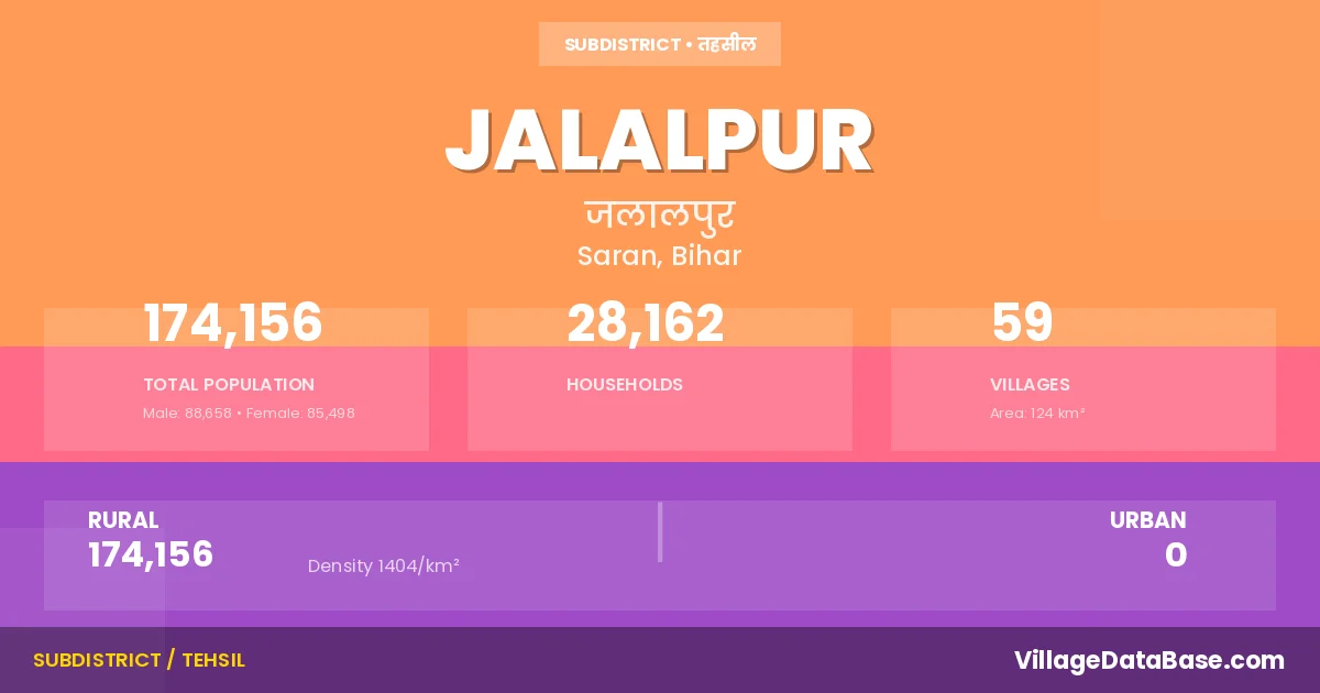 Jalalpur is a town and Subdivision in the Saran district of the Bihar. In India, a Subdivision is a subdivision of a district responsible for the administration and revenue collection of a specific area within the district. Subdivisions play a crucial role in the local governance structure, contributing significantly to the development and administration of their communities.