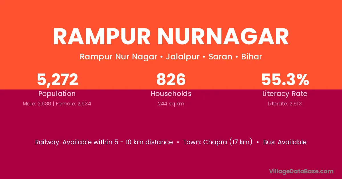 Chapra (17 km) is the nearest town to Rampur Nurnagar village for major economic activities and is located approximately 17 km away.