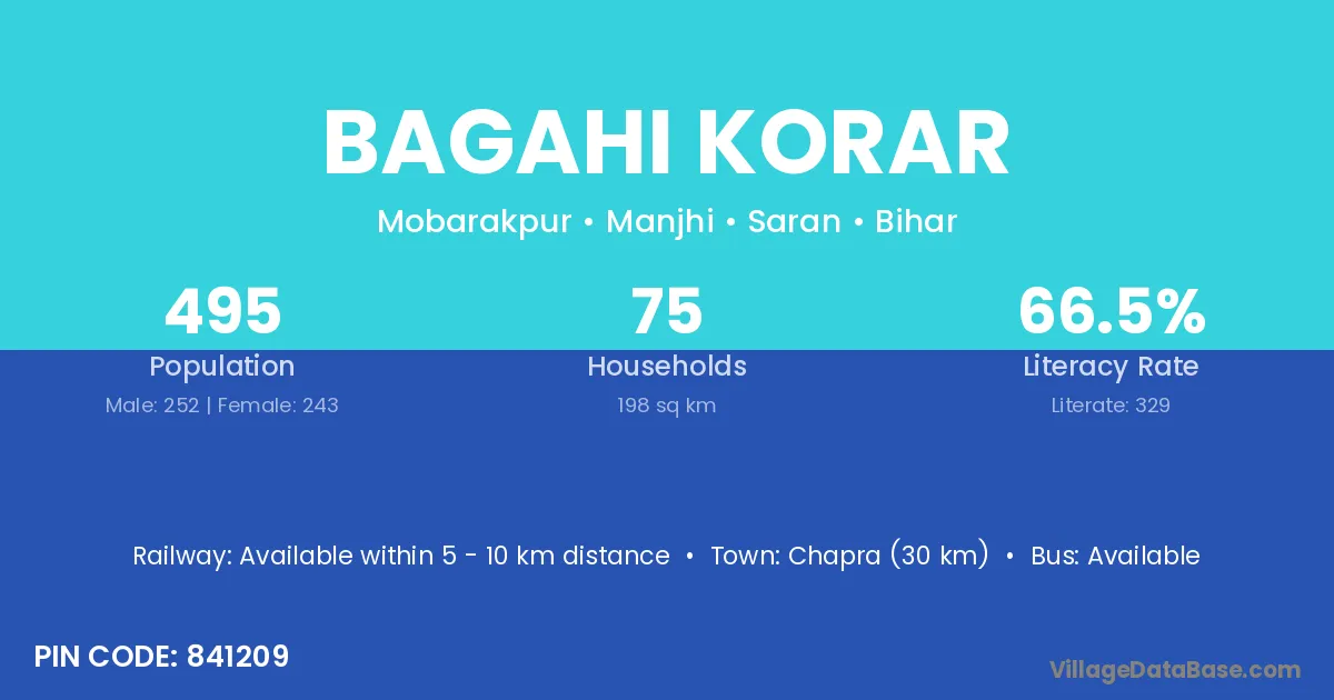 Chapra (30 km) is the nearest town to Bagahi Korar village for major economic activities and is located approximately 30 km away.