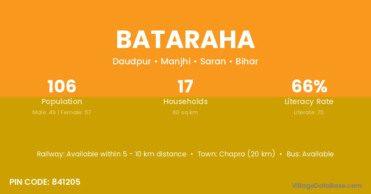 Chapra (20 km) is the nearest town to Bataraha village for major economic activities and is located approximately 20 km away.