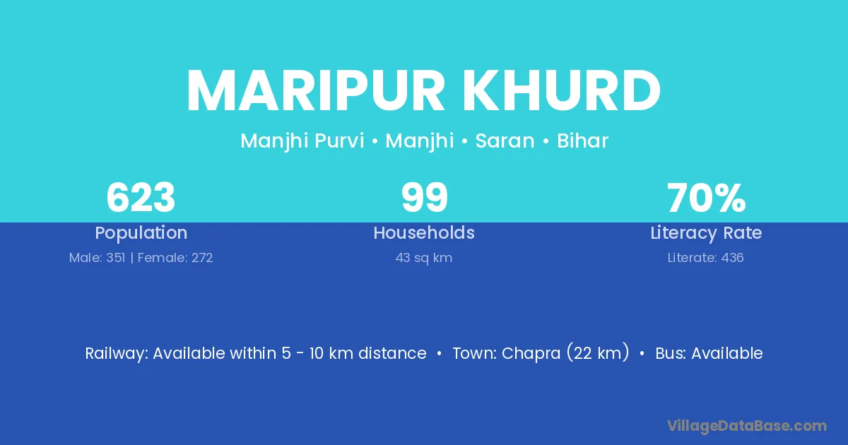 Chapra (22 km) is the nearest town to Maripur Khurd village for major economic activities and is located approximately 22 km away.