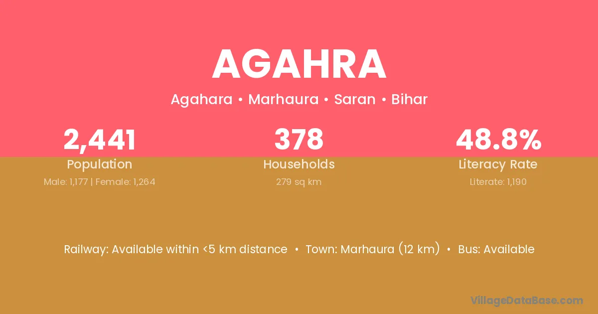 Marhaura (12 km) is the nearest town to Agahra village for major economic activities and is located approximately 12 km away.