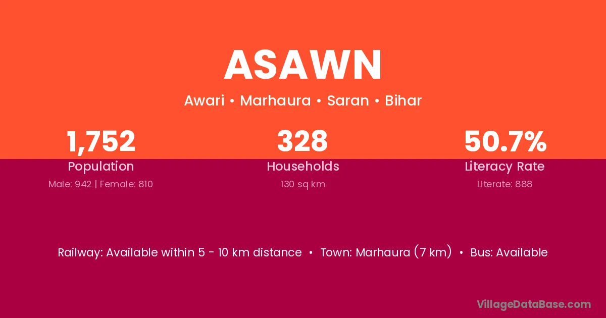 Marhaura (7 km) is the nearest town to Asawn village for major economic activities and is located approximately 7 km away.