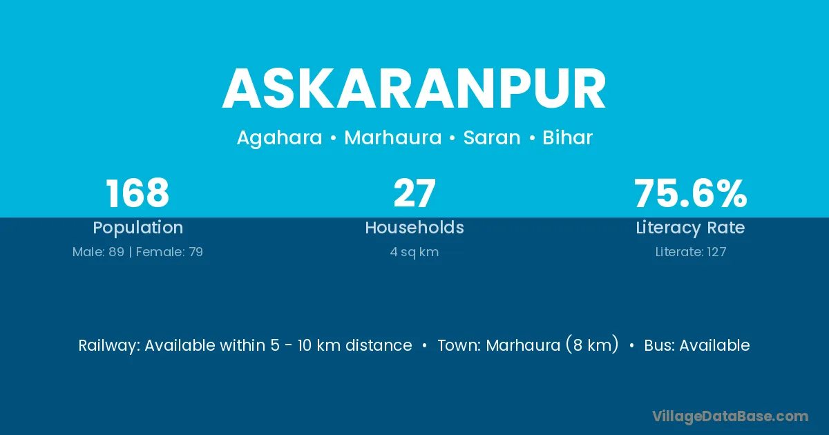 Marhaura (8 km) is the nearest town to Askaranpur village for major economic activities and is located approximately 8 km away.