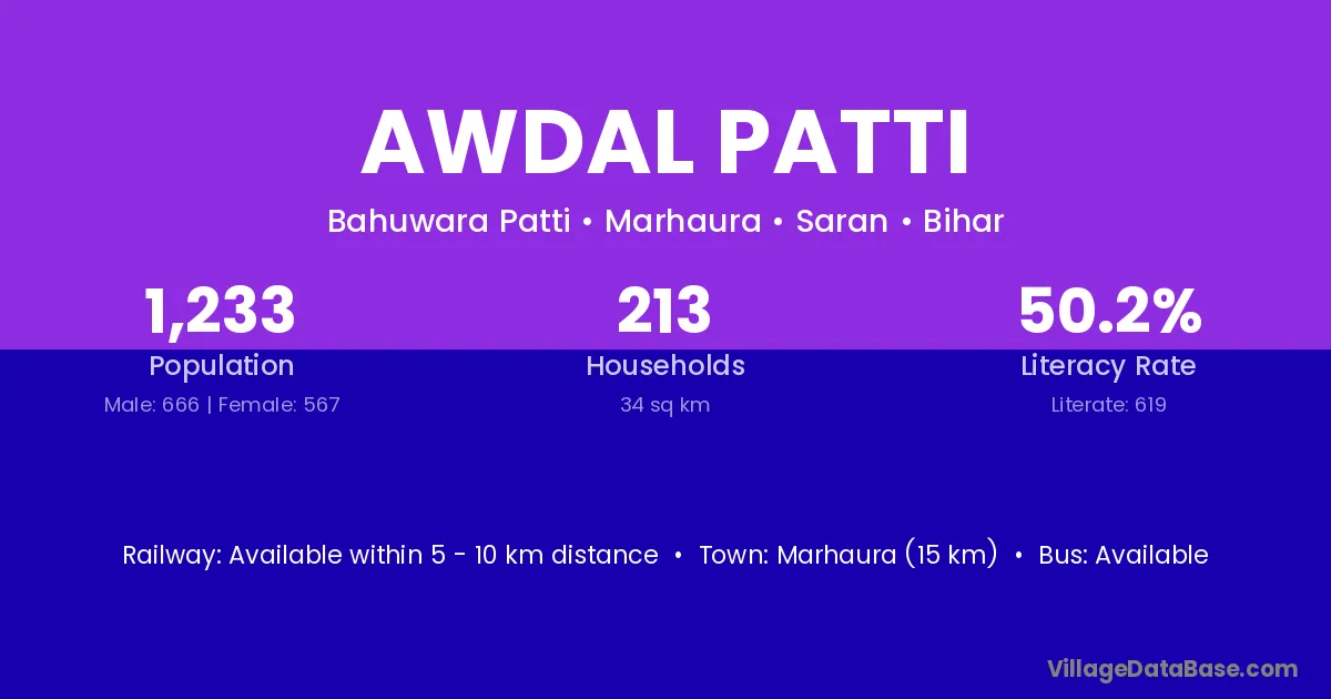 Marhaura (15 km) is the nearest town to Awdal Patti village for major economic activities and is located approximately 15 km away.