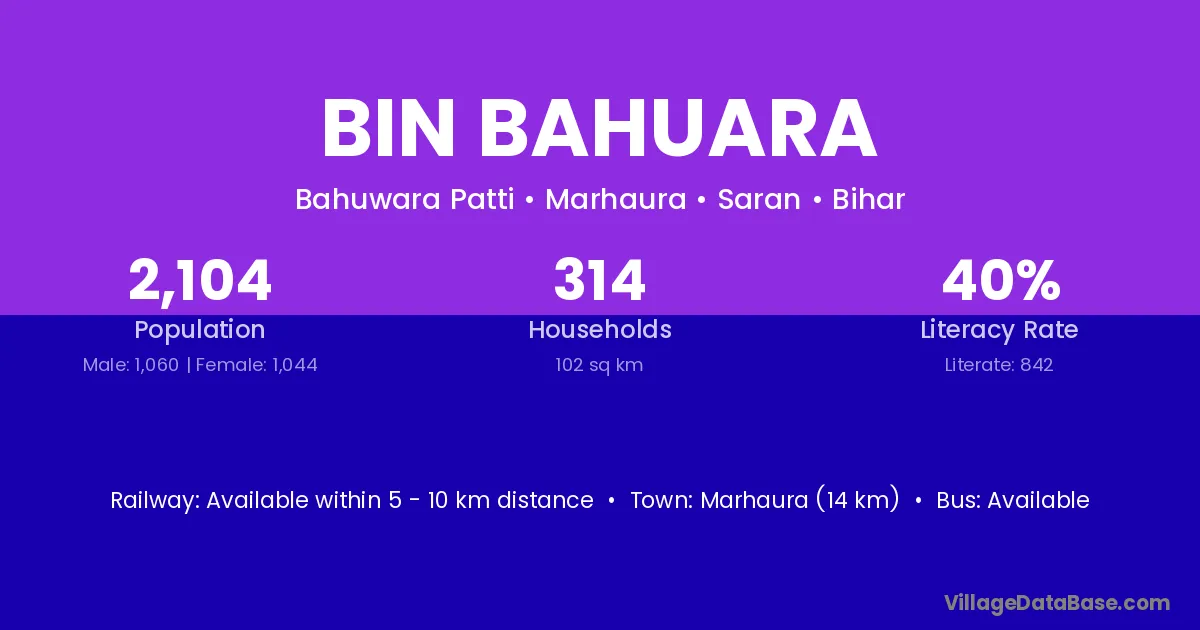 Marhaura (14 km) is the nearest town to Bin Bahuara village for major economic activities and is located approximately 14 km away.