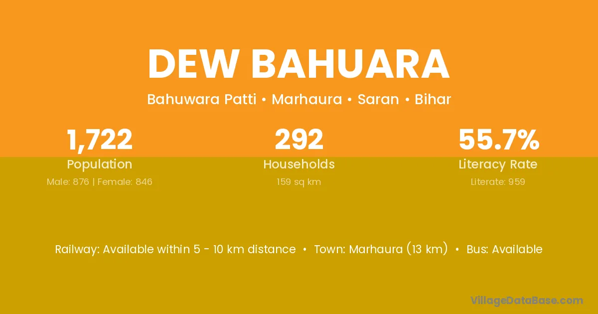 Marhaura (13 km) is the nearest town to Dew Bahuara village for major economic activities and is located approximately 13 km away.