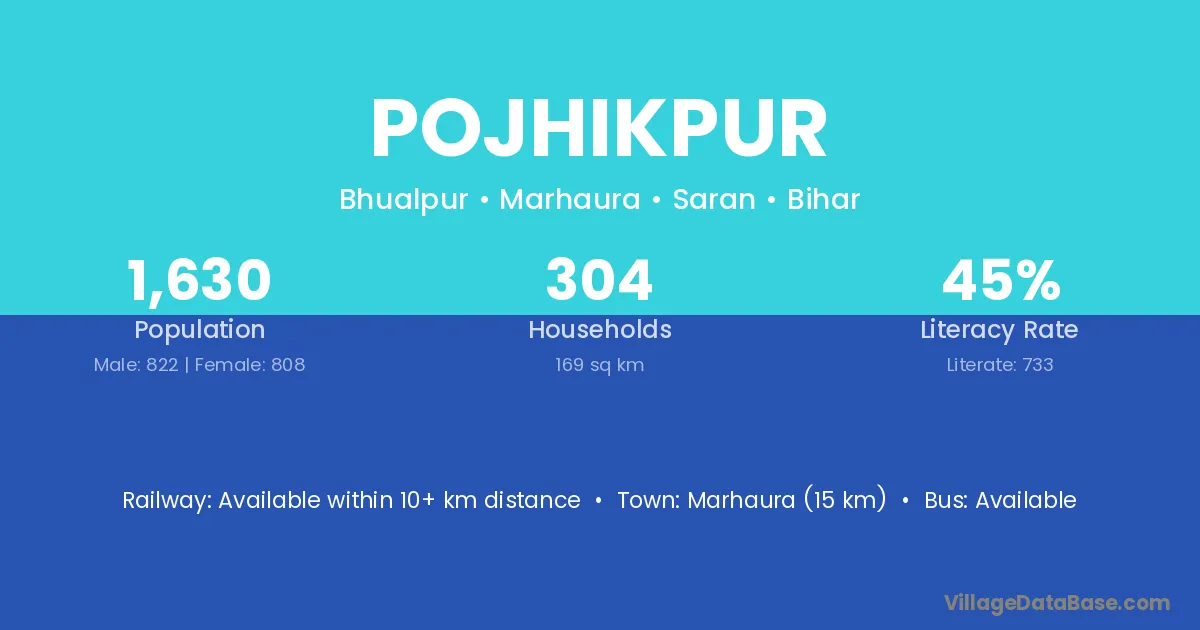 Marhaura (15 km) is the nearest town to Pojhikpur village for major economic activities and is located approximately 15 km away.