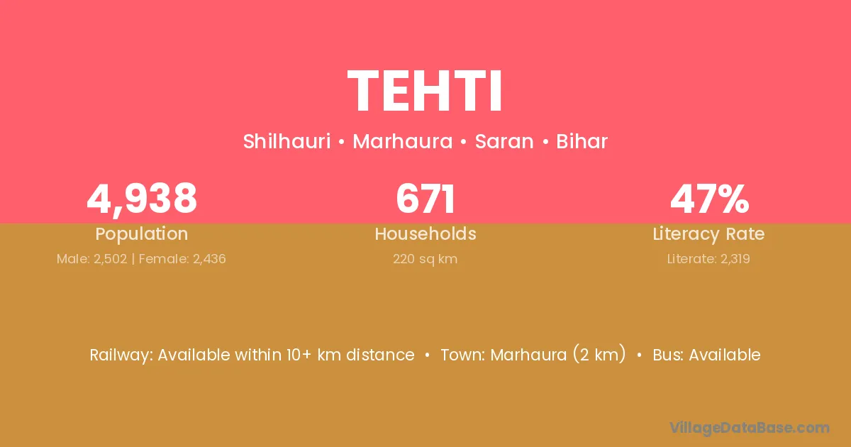 Marhaura (2 km) is the nearest town to Tehti village for major economic activities and is located approximately 2 km away.