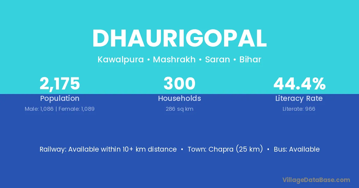Chapra (25 km) is the nearest town to Dhaurigopal village for major economic activities and is located approximately 25 km away.