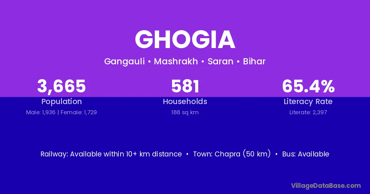 Chapra (50 km) is the nearest town to Ghogia village for major economic activities and is located approximately 50 km away.