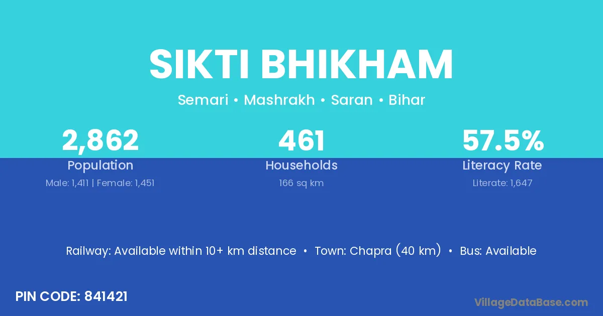 Chapra (40 km) is the nearest town to Sikti Bhikham village for major economic activities and is located approximately 40 km away.