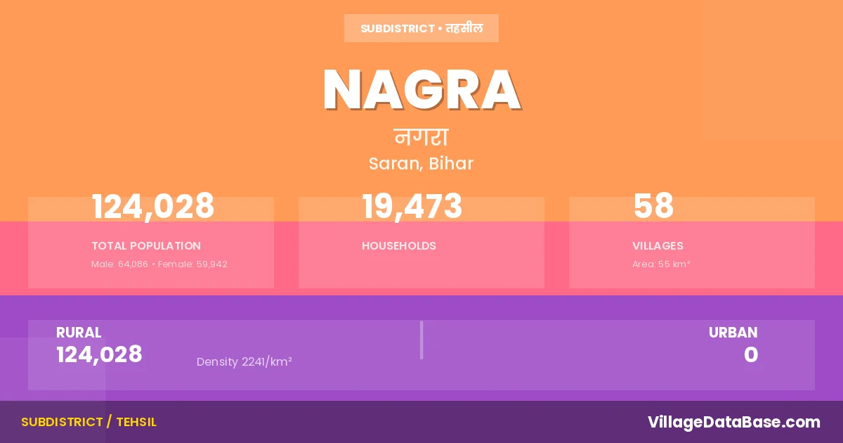 Nagra is a town and Subdivision in the Saran district of the Bihar. In India, a Subdivision is a subdivision of a district responsible for the administration and revenue collection of a specific area within the district. Subdivisions play a crucial role in the local governance structure, contributing significantly to the development and administration of their communities.