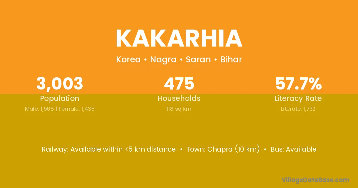 Chapra (10 km) is the nearest town to Kakarhia village for major economic activities and is located approximately 10 km away.