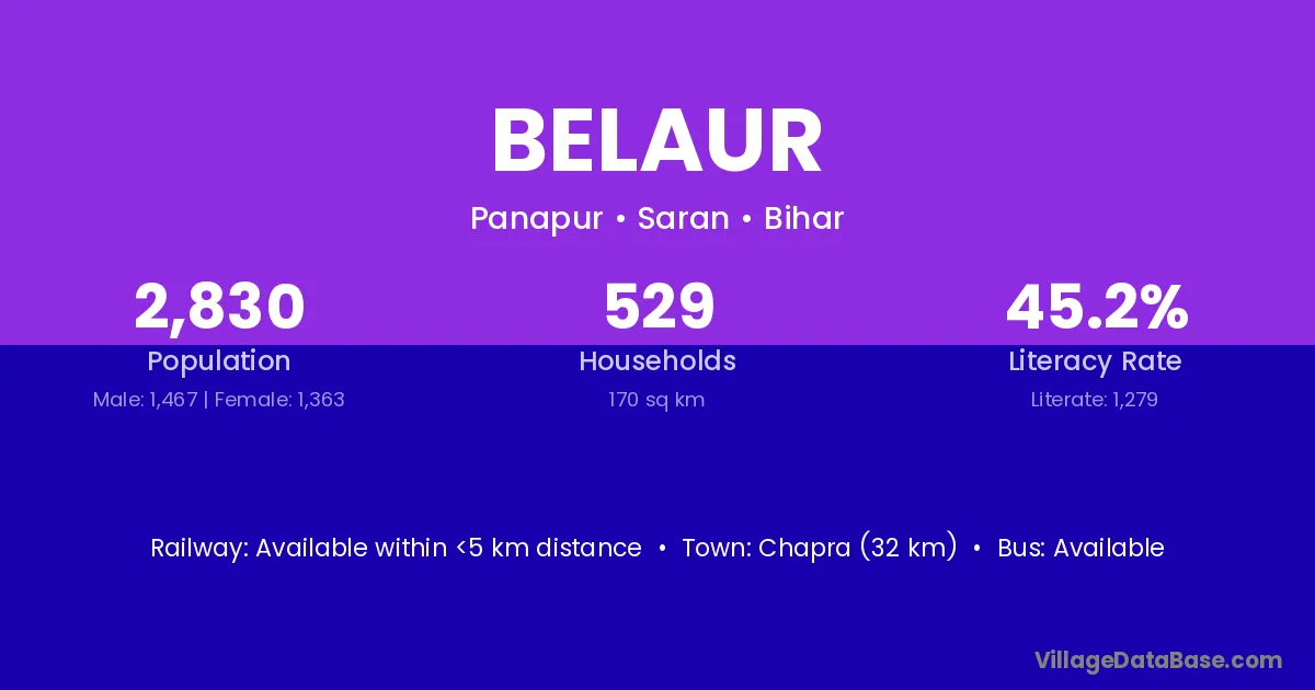 Chapra (32 km) is the nearest town to Belaur village for major economic activities and is located approximately 32 km away.