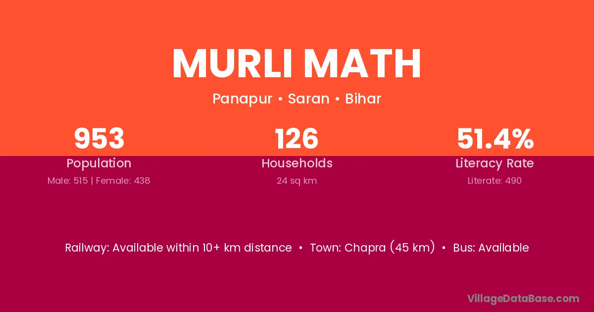 Chapra (45 km) is the nearest town to Murli Math village for major economic activities and is located approximately 45 km away.