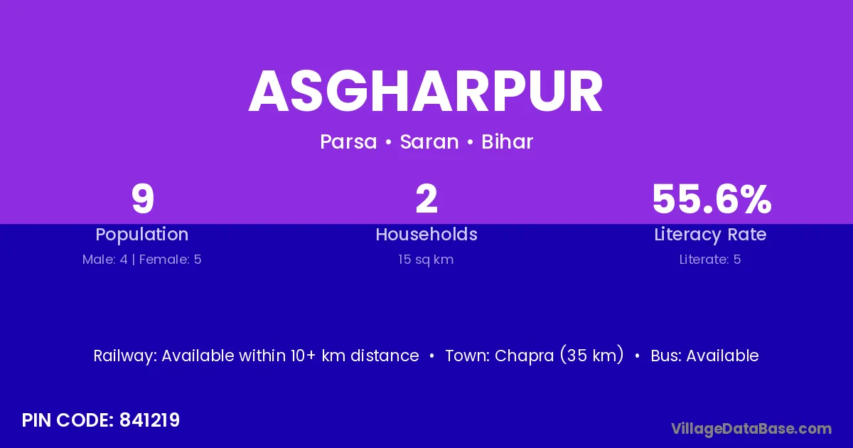 Chapra (35 km) is the nearest town to Asgharpur village for major economic activities and is located approximately 35 km away.