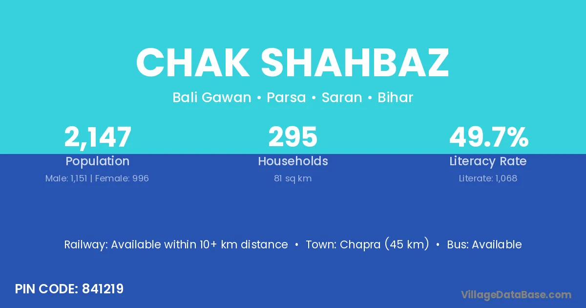 Chapra (45 km) is the nearest town to Chak Shahbaz village for major economic activities and is located approximately 45 km away.