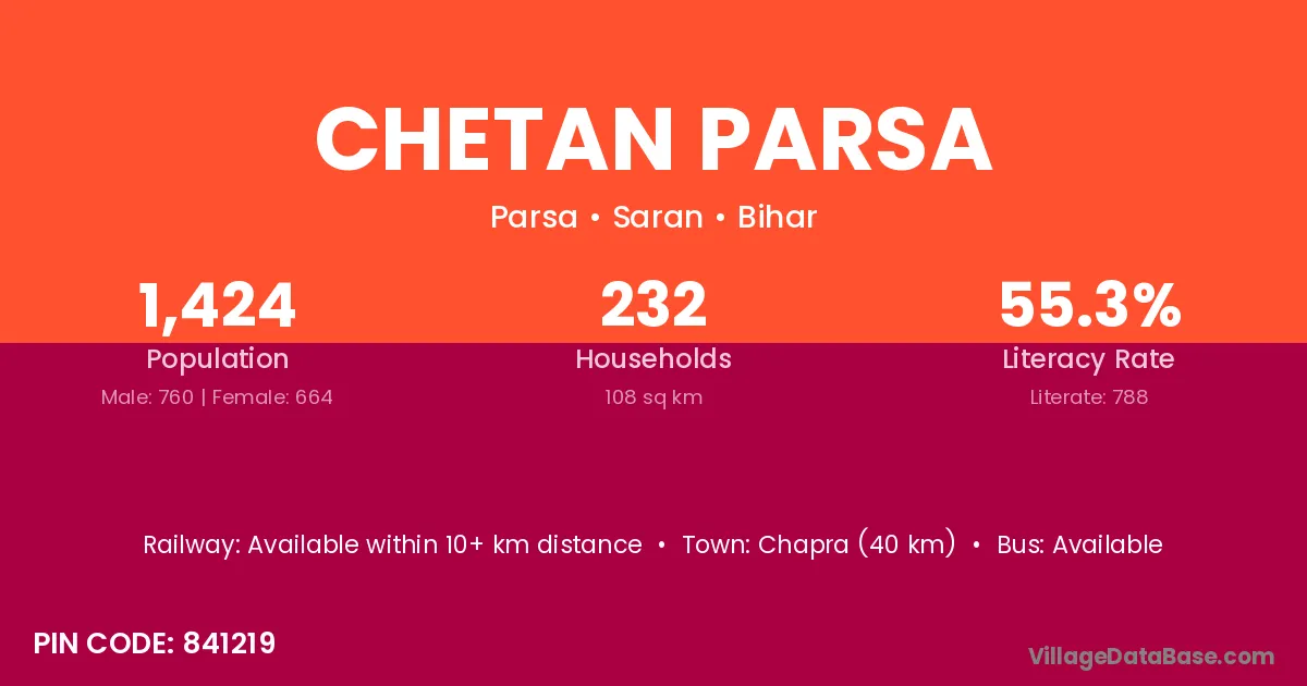 Chapra (40 km) is the nearest town to Chetan Parsa village for major economic activities and is located approximately 40 km away.