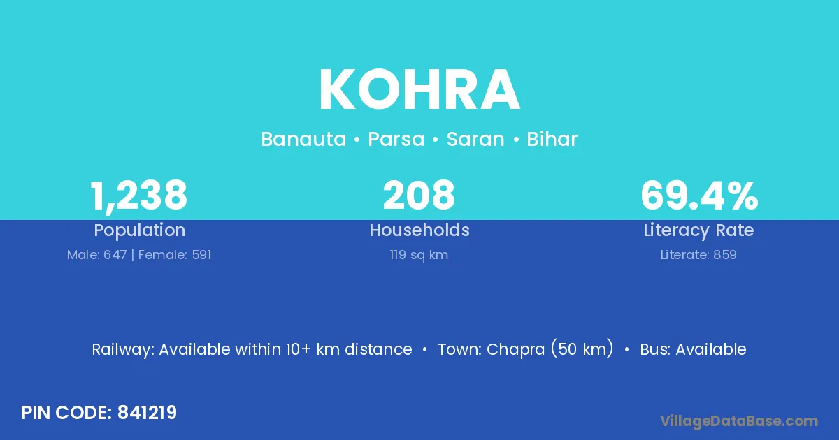 Chapra (50 km) is the nearest town to Kohra village for major economic activities and is located approximately 50 km away.