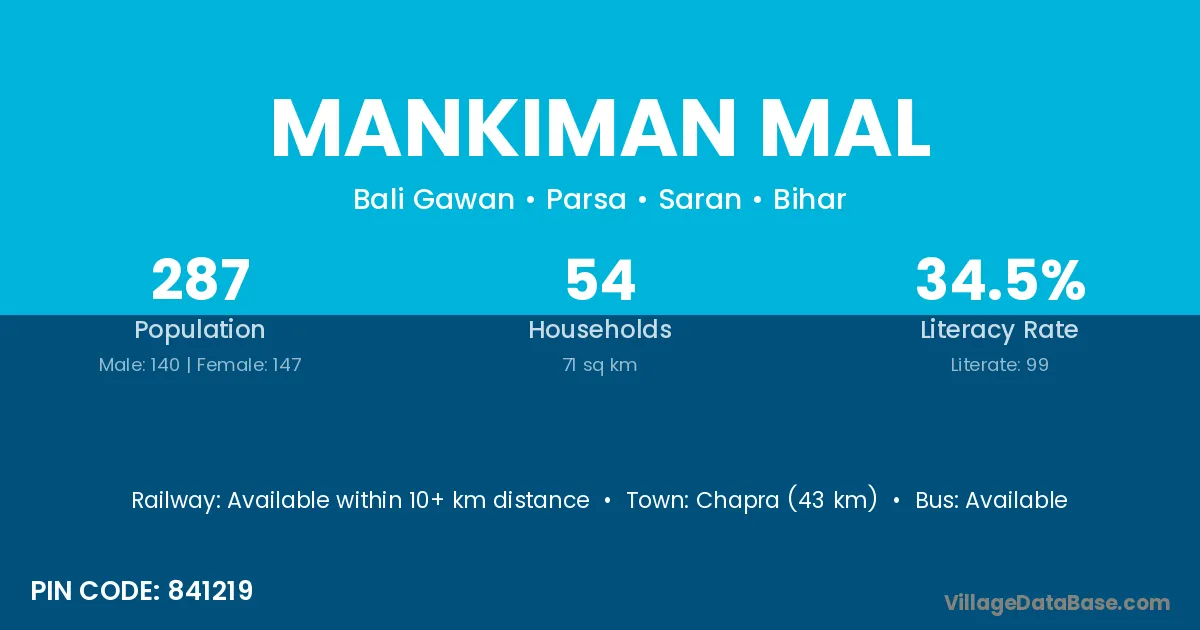 Chapra (43 km) is the nearest town to Mankiman Mal village for major economic activities and is located approximately 43 km away.