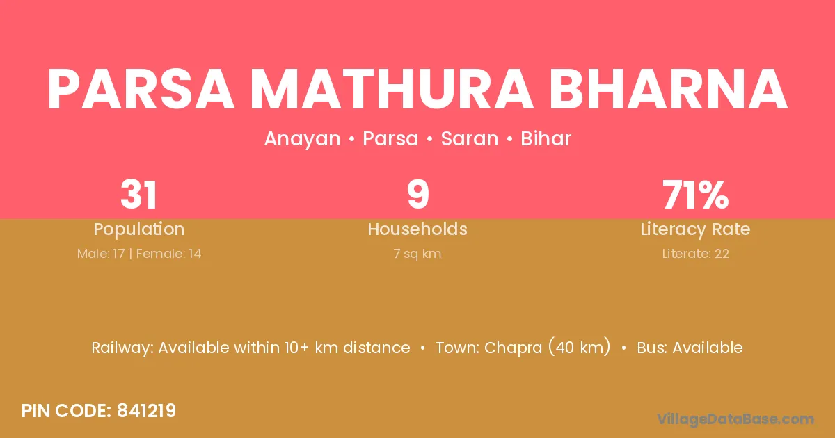 Parsa Mathura Bharna village has a total population of 31 people, of which 17 are males and 14 are females.