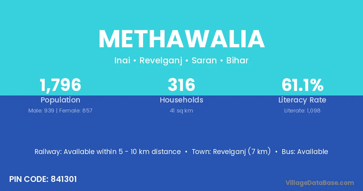 Revelganj (7 km) is the nearest town to Methawalia village for major economic activities and is located approximately 7 km away.