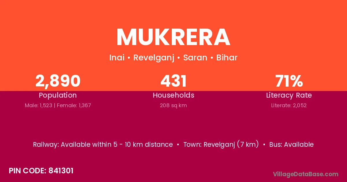 Revelganj (7 km) is the nearest town to Mukrera village for major economic activities and is located approximately 7 km away.