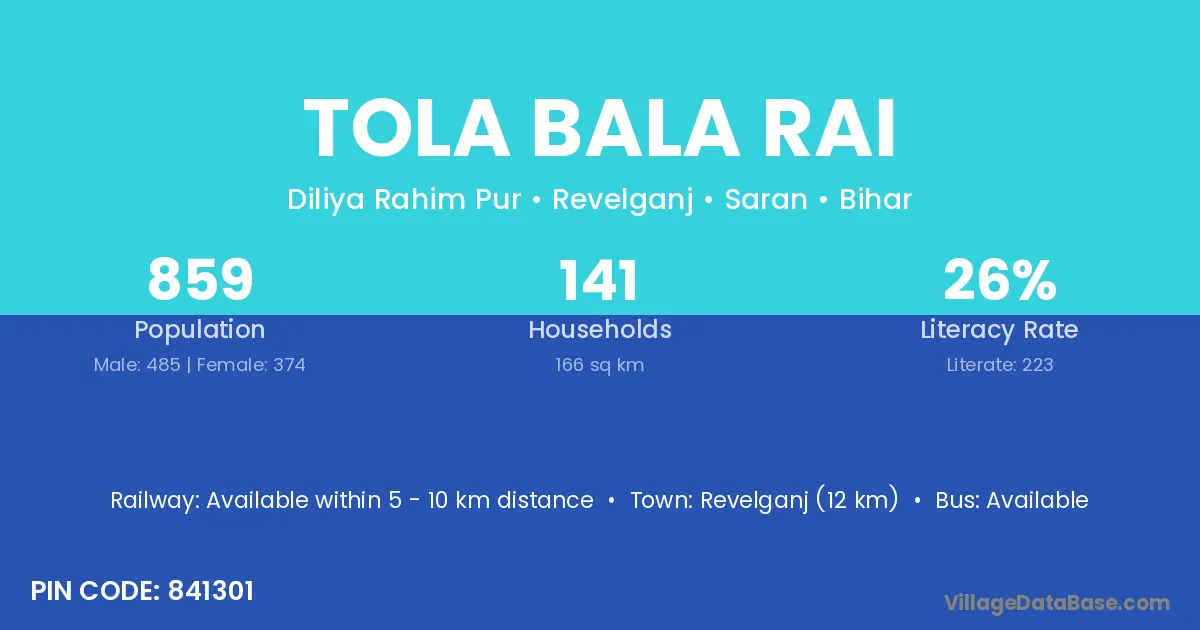 Revelganj (12 km) is the nearest town to Tola Bala Rai village for major economic activities and is located approximately 12 km away.