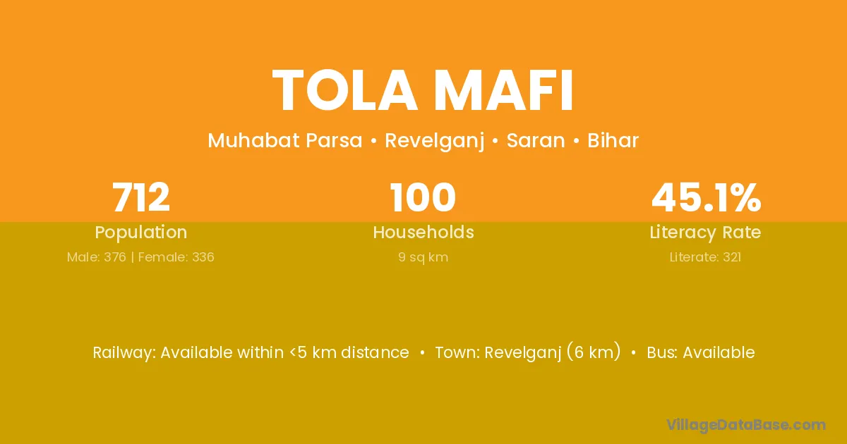 Revelganj (6 km) is the nearest town to Tola Mafi village for major economic activities and is located approximately 6 km away.