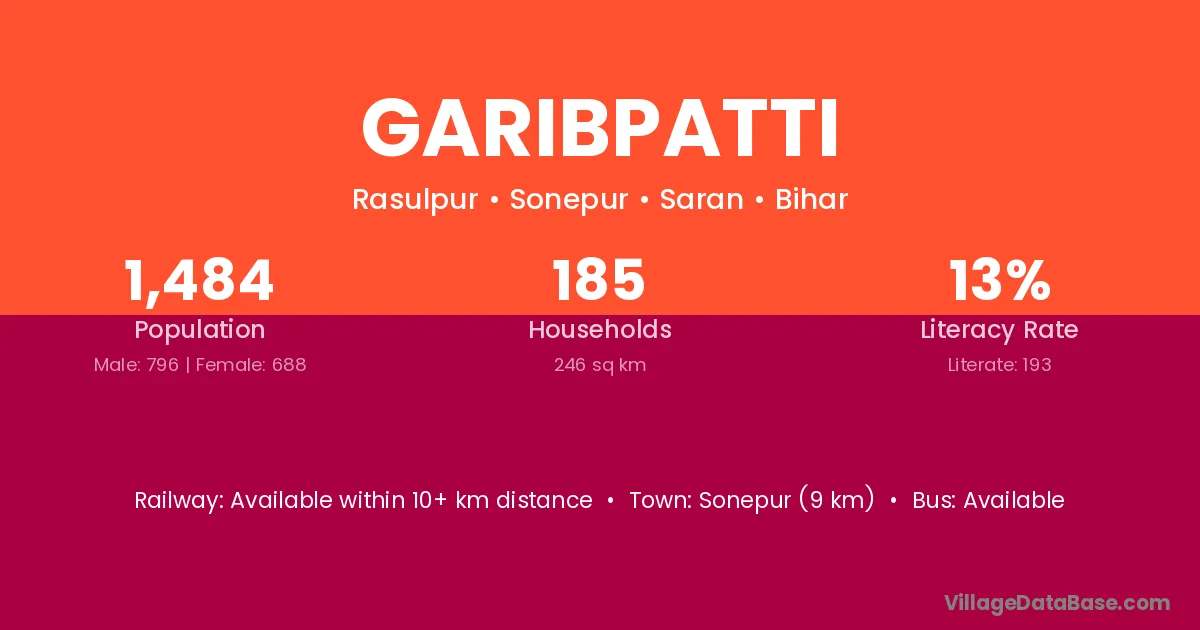 Garibpatti village has a total population of 1,484 people, of which 796 are males and 688 are females.
