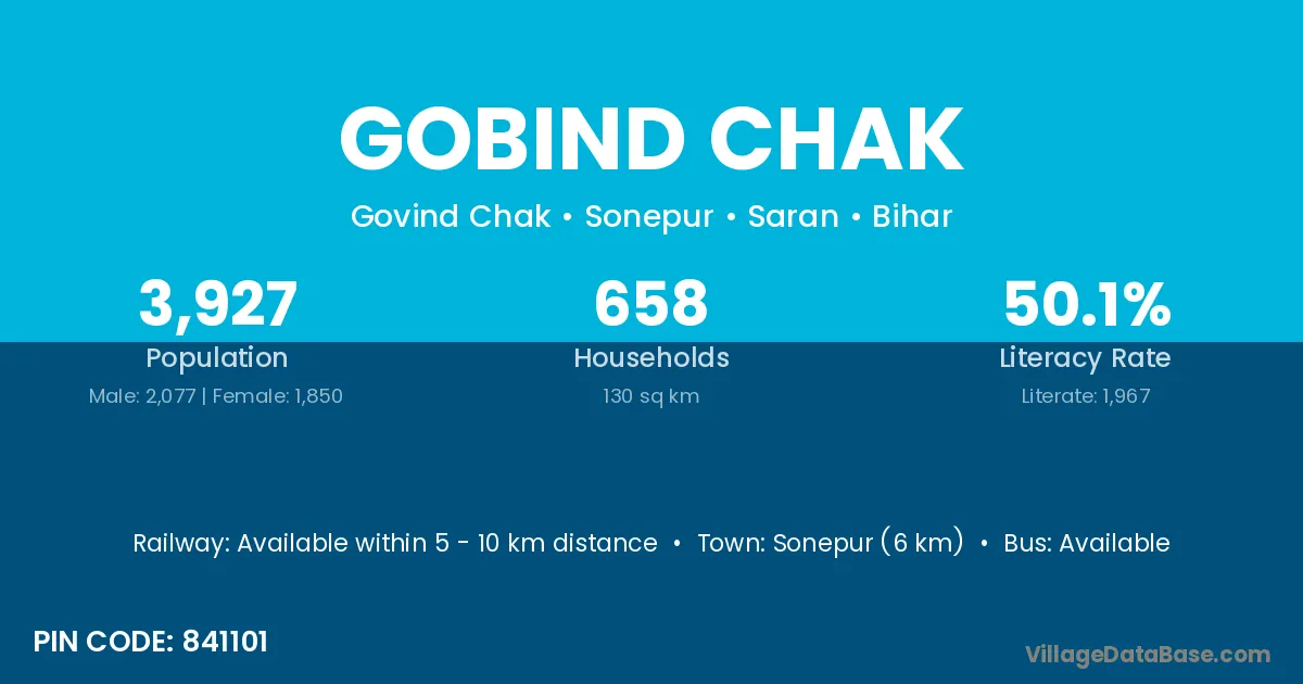 Gobind Chak village has a total population of 3,927 people, of which 2,077 are males and 1,850 are females.