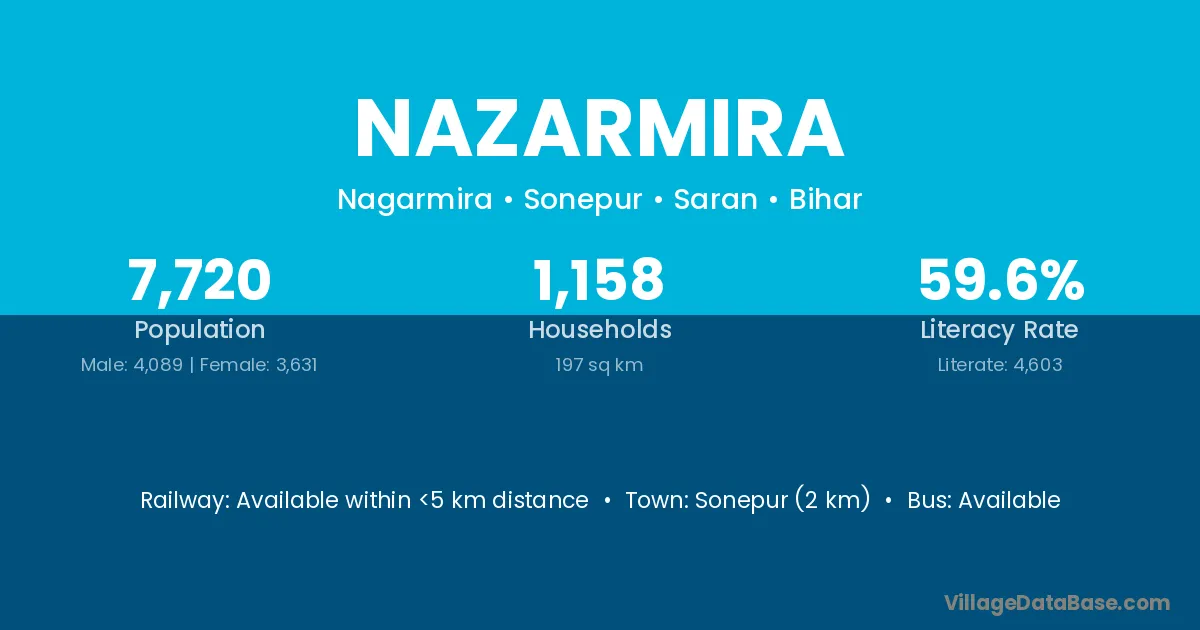 Nazarmira village has a total population of 7,720 people, of which 4,089 are males and 3,631 are females.