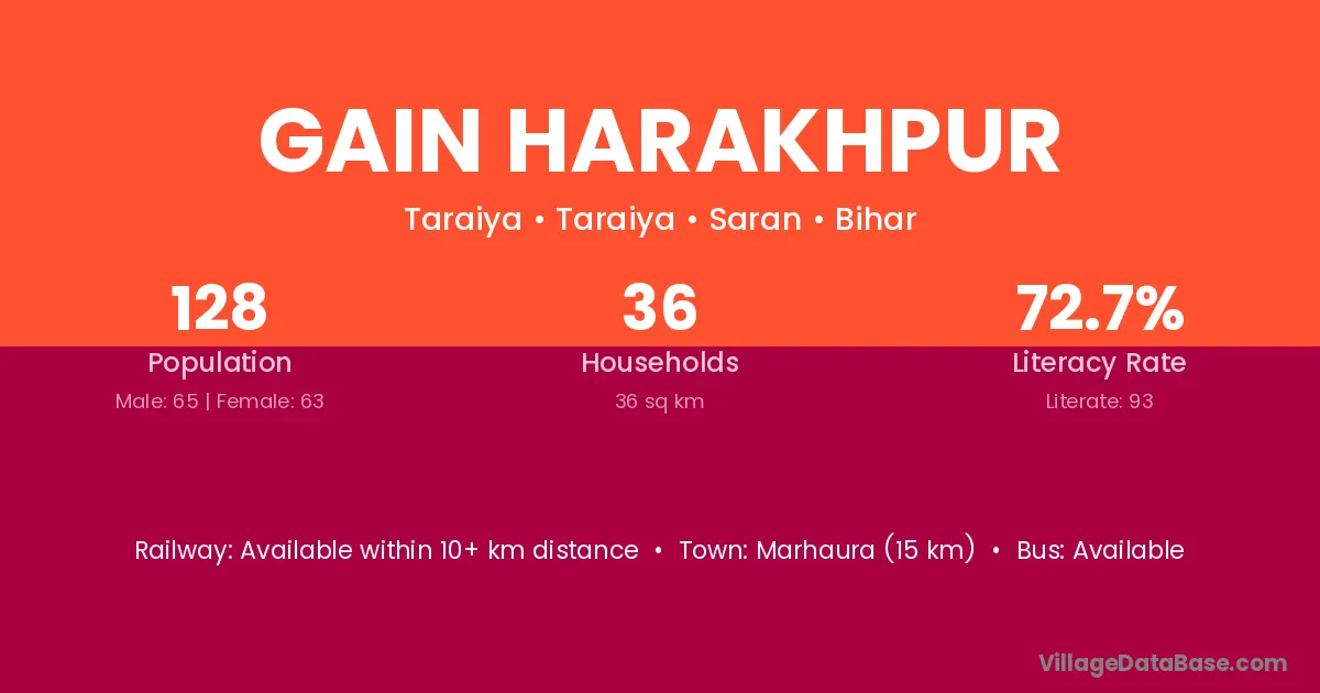 Marhaura (15 km) is the nearest town to Gain Harakhpur village for major economic activities and is located approximately 15 km away.