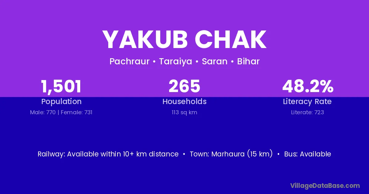Marhaura (15 km) is the nearest town to Yakub Chak village for major economic activities and is located approximately 15 km away.