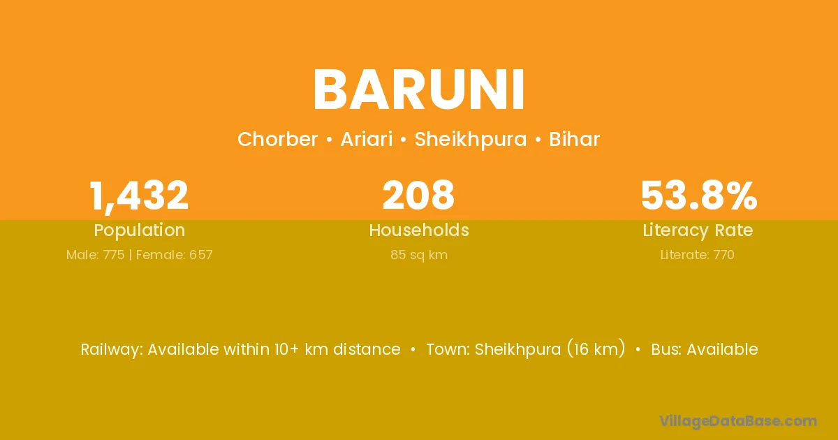 Sheikhpura (16 km) is the nearest town to Baruni village for major economic activities and is located approximately 16 km away.